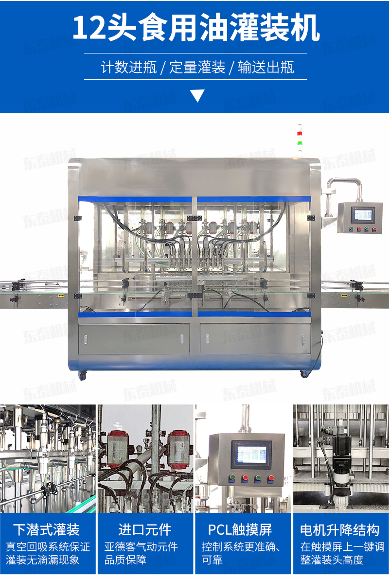 灌裝機(jī)簡述 該系列灌裝機(jī)采用容積式計量灌裝原理,適用于各種規(guī)(100ml-1000ml)的南瓜籽油、榛子油、牡丹籽油、芝麻油、核桃油、山茶油、亞麻籽油、棉籽油、橄欖油、大豆油、玉米油