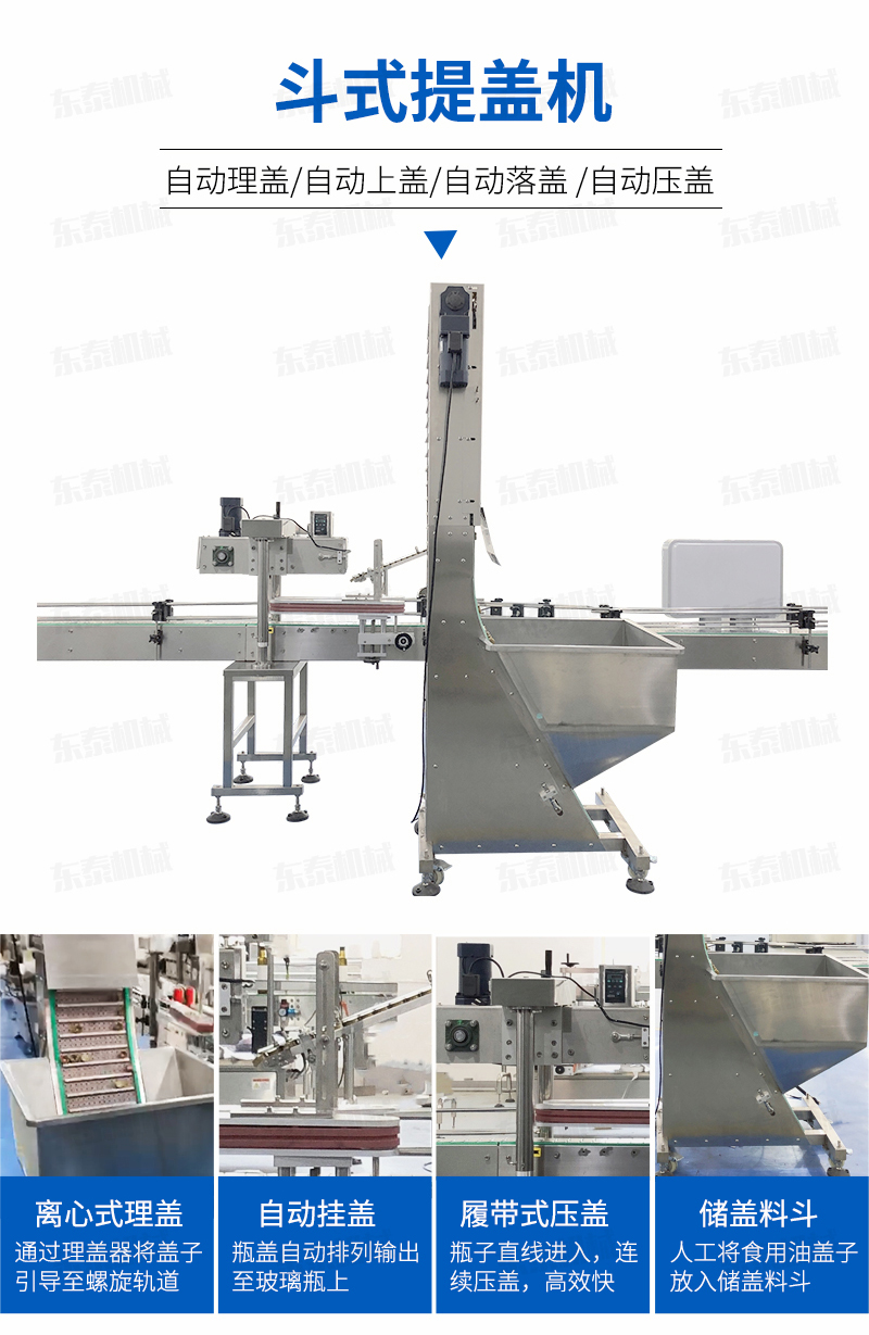 該提蓋式主要適用于制藥、食品、化工、日化等行業(yè),是自動化生產(chǎn)線中旋蓋機(jī)、壓蓋機(jī)等的理想配套設(shè)備。采用底部添蓋替代傳統(tǒng)的手動上蓋,使自動化工作更加方便、快捷。特別是對于要求不能有磨損的瓶蓋如印刷好后的蓋子需要到下一步工序生產(chǎn)或者包裝等,此設(shè)備也可強(qiáng)有效的減少磨損;其工作原理是通過微動開關(guān)檢測的作用,通過輸送刮板,把料斗里的瓶蓋按生產(chǎn)需要勻速的送入理蓋器中,確保了理蓋器內(nèi)的瓶蓋能保持在佳的狀態(tài);