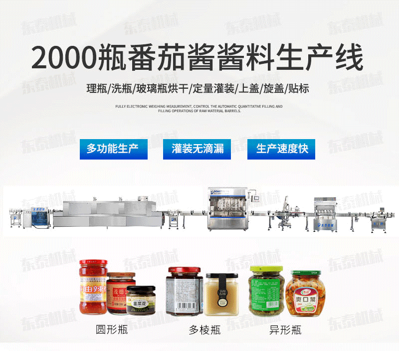 番茄醬灌裝旋蓋生產(chǎn)設(shè)備組成: 自動供瓶機+全自動滾筒洗瓶機+自動六米烘干機+自動收瓶機+全自動六頭灌裝機自動灌裝+全自動提蓋機自動理蓋、提蓋、掛蓋+六頭真空旋蓋機同時六個頭真空旋蓋+套標(biāo)機+收縮