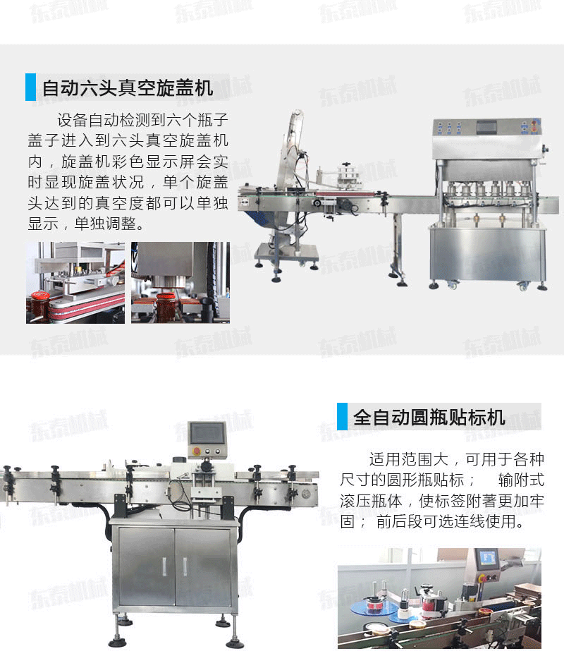自動供瓶機+全自動滾筒洗瓶機+自動六米烘干機+自動收瓶機+全自動六頭灌裝機自動灌裝+全自動提蓋機自動理蓋、提蓋、掛蓋+六頭真空旋蓋機同時六個頭真空旋蓋+套標(biāo)機+收縮機+圓瓶貼標(biāo)機+整理平臺;