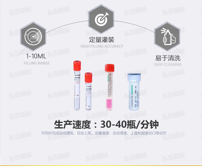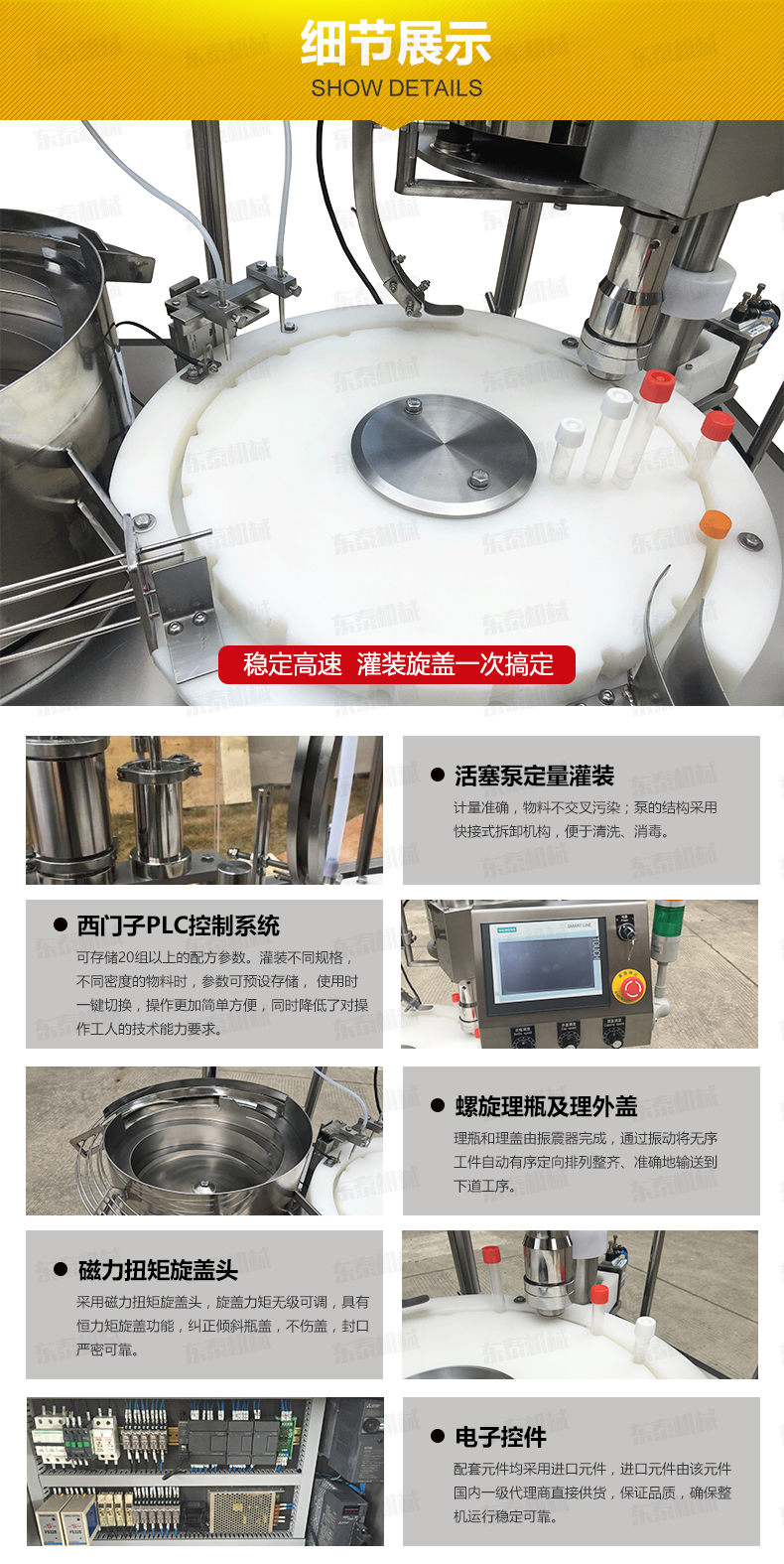 本機(jī)是在引進(jìn)和吸收國(guó)外技術(shù)的基礎(chǔ)上,由我公司自主研發(fā)的一款I(lǐng)VD診斷試劑灌裝旋蓋一體機(jī),能同時(shí)完成自動(dòng)理瓶、自動(dòng)上瓶、定量灌裝、自動(dòng)理蓋、上蓋和旋蓋封口等動(dòng)作。本機(jī)采用日本高精度封閉式凸輪分度工位器,精度高,運(yùn)行可靠,使用壽命長(zhǎng)。該分度器結(jié)構(gòu)簡(jiǎn)單,長(zhǎng)期使用無(wú)需維修。該型號(hào)設(shè)備主要用于ⅣD體外診斷試劑制藥、生物制藥行業(yè)及科研領(lǐng)域裝。機(jī)器設(shè)計(jì)緊湊合理、外形簡(jiǎn)潔美觀,灌裝量調(diào)節(jié)方便。