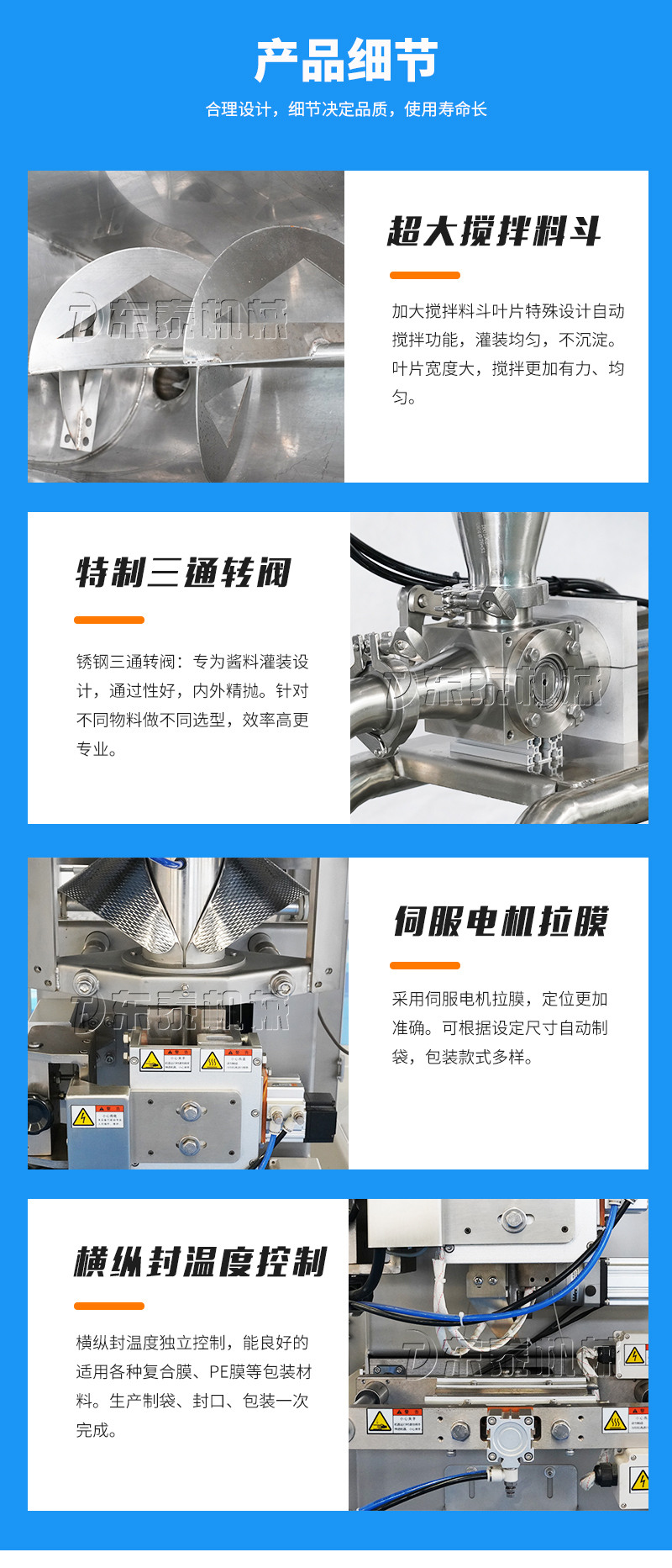 本機(jī)器主要用于調(diào)味品醬料的自動(dòng)化包裝,機(jī)器安裝有橫向螺帶式攪拌,使油醬混合均勻,確保灌裝精度和產(chǎn)品包裝成品的均勻性。灌裝計(jì)量設(shè)備安裝有萬(wàn)向輪,管路鏈接均采用快拆接頭,方便灌裝機(jī)拆卸移動(dòng)清洗。包裝設(shè)備采用全伺服驅(qū)動(dòng)器,包裝速度快,運(yùn)行穩(wěn)定。