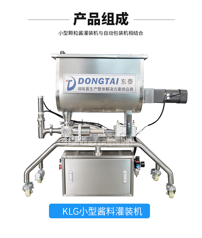 本機(jī)器主要用于調(diào)味品醬料的自動(dòng)化包裝,機(jī)器安裝有橫向螺帶式攪拌,使油醬混合均勻,確保灌裝精度和產(chǎn)品包裝成品的均勻性。灌裝計(jì)量設(shè)備安裝有萬(wàn)向輪,管路鏈接均采用快拆接頭,方便灌裝機(jī)拆卸移動(dòng)清洗。包裝設(shè)備采