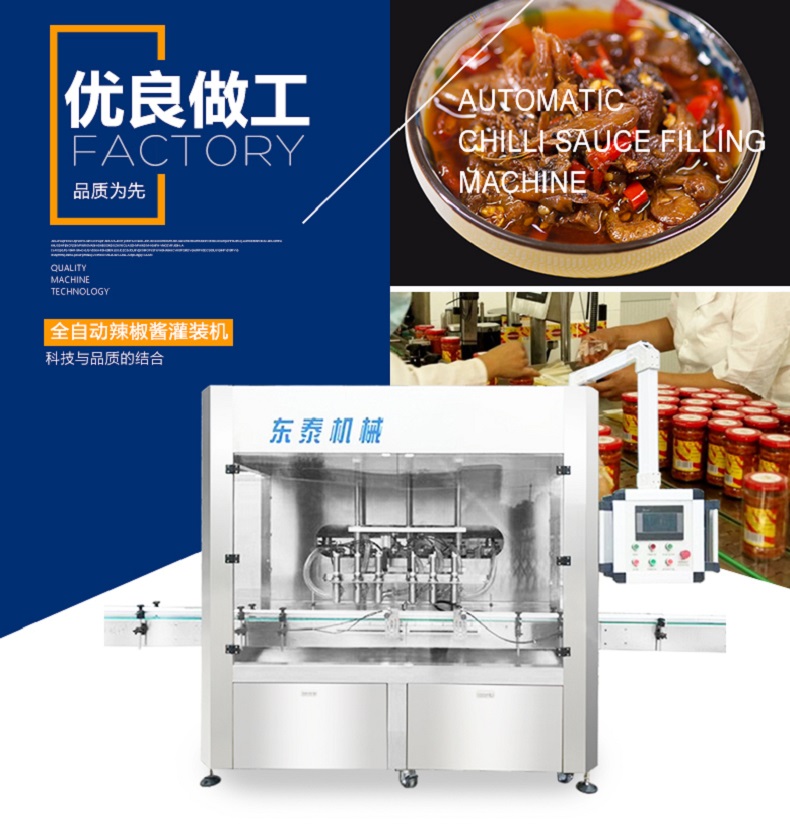 全自動辣椒醬類醬體灌裝生產(chǎn)線作為公司新研發(fā)的灌裝設(shè)備在市場上起到了關(guān)鍵性的作用,獨特的技術(shù)讓整個包裝市場變得富有生命力,是集光,機,電,氣于一體,采用活塞式定量原理,灌裝精度高,操作簡單,維護方便,設(shè)備主要材質(zhì):采用SUS304不銹鋼制造,符合衛(wèi)生要求.灌裝過程采用亞克力透明板與外界隔離,保證灌裝的衛(wèi)生要求。灌裝采用壓力式灌裝,無需配裝高位罐,簡化了安裝工序,提高了灌裝效率。可廣泛應(yīng)用于食品、醬料行業(yè)產(chǎn)品的自動化包裝生產(chǎn)。幾乎能夠灌裝所有醬類、醬料物體是該款全自動辣椒醬類醬體灌裝生產(chǎn)線最大的優(yōu)勢,包括大塊肉醬、顆粒醬、濃醬、豆瓣醬、甜面醬、辣椒醬等。