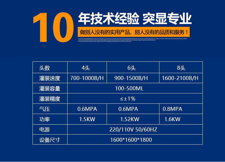 設(shè)備特點: 1、快速清洗、便于調(diào)整、容積缸體動作無極調(diào)速,適合不同規(guī)格、不同物料的灌裝。充填量一次調(diào)整完畢,每個容積缸體可分別微量調(diào)節(jié),灌裝精度高且一致性好。接觸物料的材料為316不銹鋼、硅橡膠、符合QS規(guī)范。 2、進口減速電機無極調(diào)速控制灌裝柱塞缸,不僅適合各種膏體,亦適合醬料。 3、進口電磁離合器和電磁制動器配合動作,消除慣性,灌裝精度高。 4、人機界面與PLC通訊,調(diào)試設(shè)備或更換品種只需在屏幕上設(shè)定。進瓶、定位、灌裝充填、出瓶均自動作業(yè)。 5、灌裝時瓶子不到位、瓶子堵塞活出液管沒有插進瓶子時設(shè)備將自動保護,排除后繼續(xù)作業(yè)。