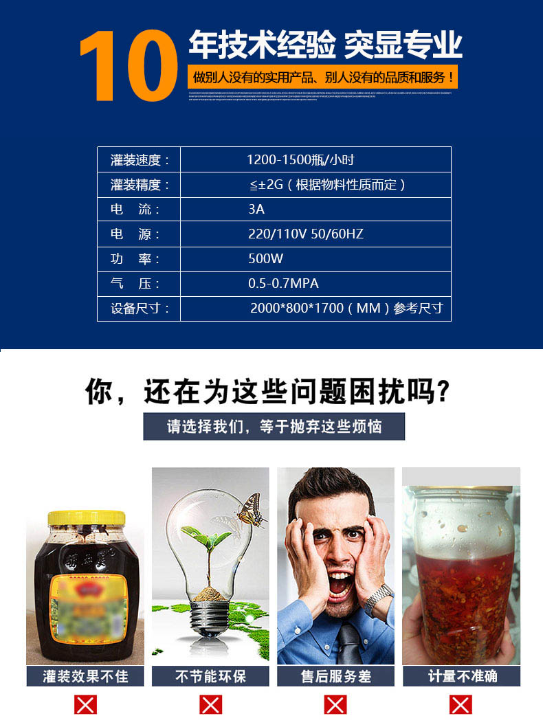 2.灌裝機(jī)采用橫推料的方式,大大縮短了下料斗到灌裝頭的距離,提高了灌裝速度,更重要的是解決了含油量大的物料在灌裝過(guò)程中出現(xiàn)的有些瓶油多,有些瓶醬多的灌裝難題,大大提高了灌裝精度。